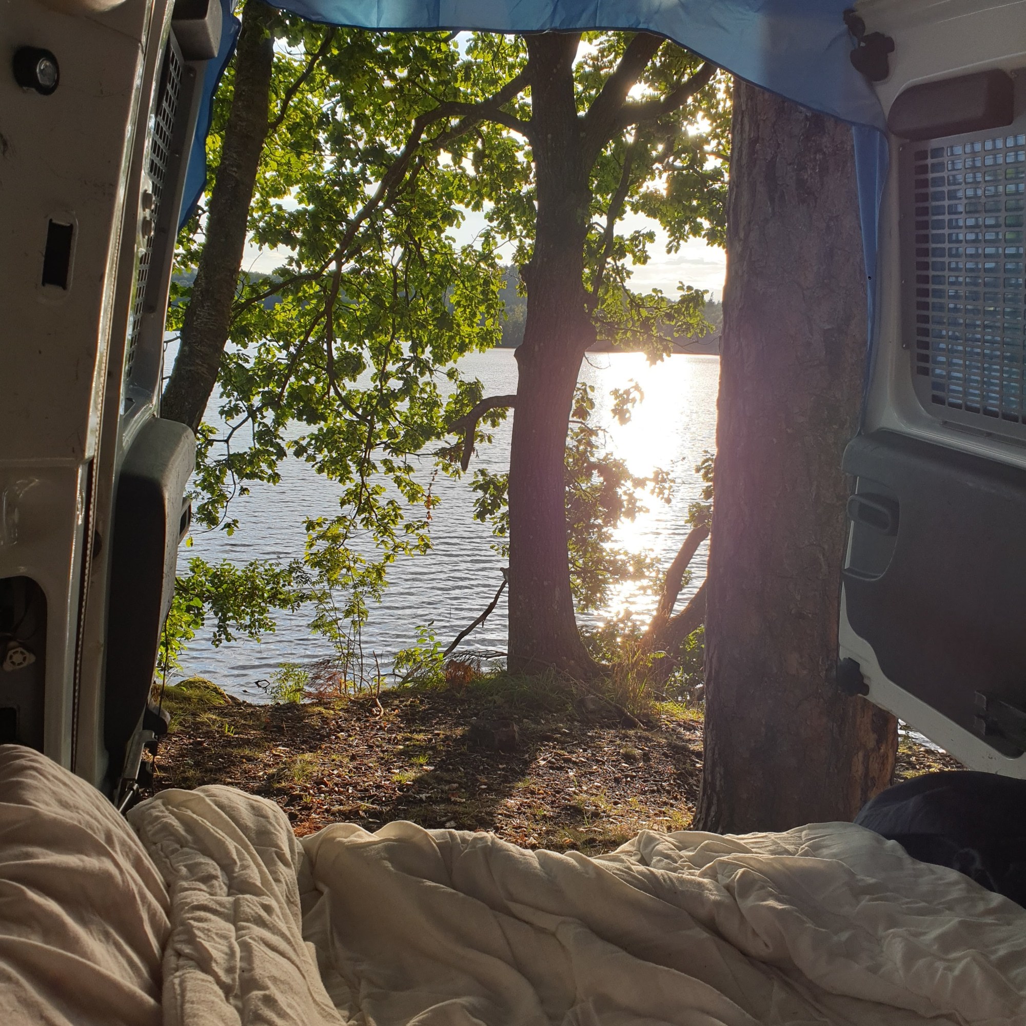 Och här fick vi vara helt ensamma. Vi kunde backa ner Happy till vattenbrynet och njuta av solnedgång och lugnt kluckande vatten. Gaston kunde springa omkring löst, vilket han så sällan gör nu när vi inte är på landet så ofta längre så även han var en lycklig liten hund <3.