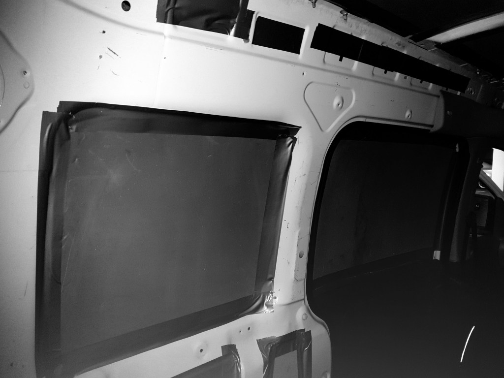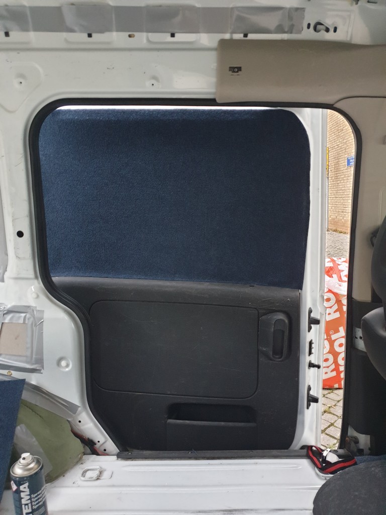 Nu har vi (försökt) sätta isolering i form av liggunderlag överallt i bilen där vi tror att det kan behövas. Tomma hålutrymmen i bjälkar etc har vi fyllt med glasfiberull och sen har alla kanter tejpats för att jämna ut innan vi sätter på sista ytskiktet – den blå nålfiltsmattan.