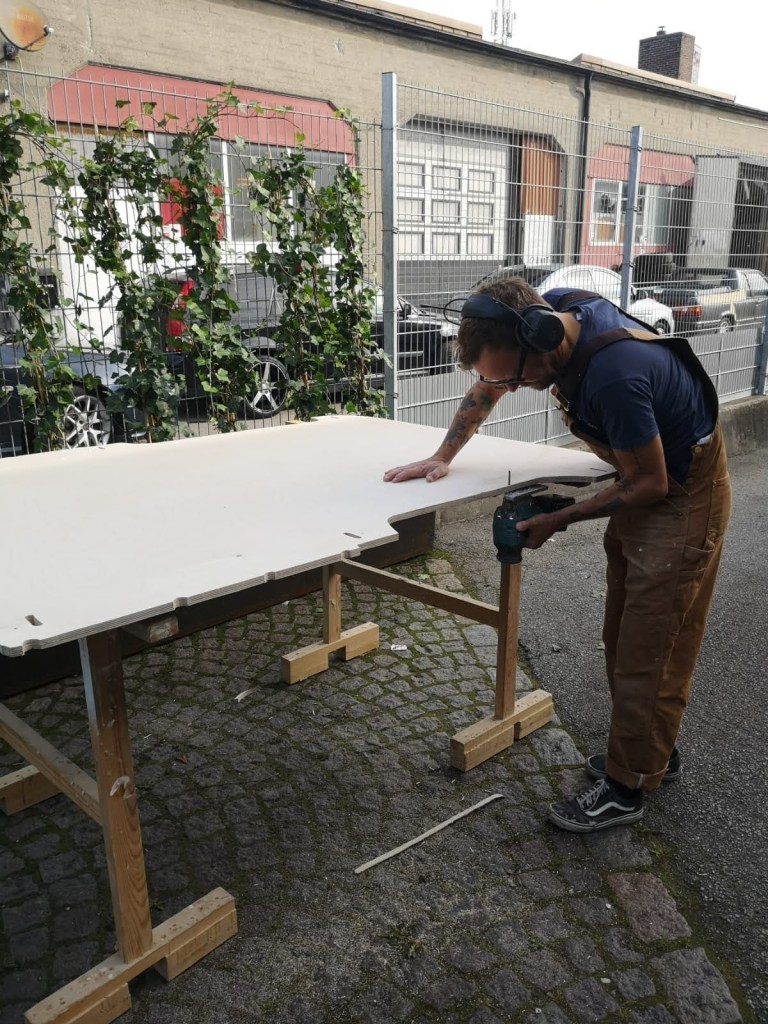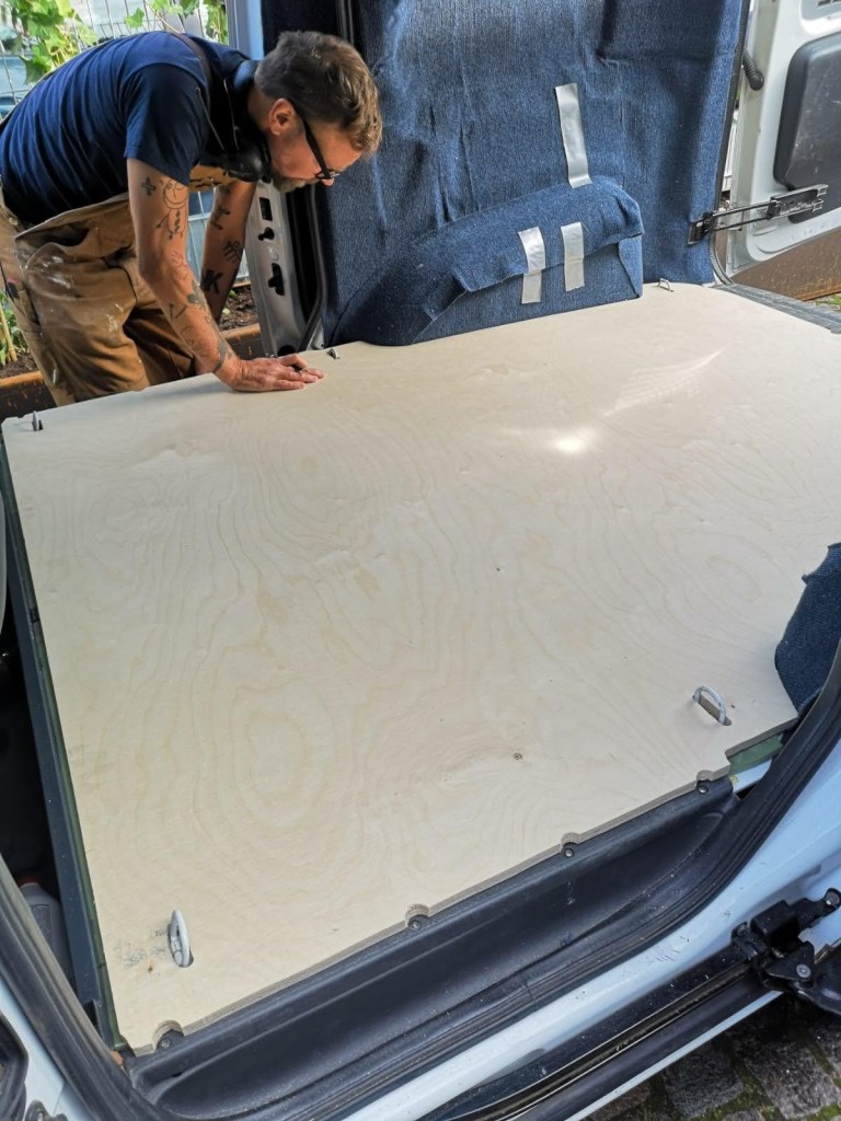 Igår gjorde Crille (möbelsnickare och Niclas fd svåger) ett suveränt jobb och hjälpte oss att formsåga till golvet till Happy – snacka om millimeterprecision! Och samtidigt så sågade han till alla delar till det som ska bli den utfällbara sängen.