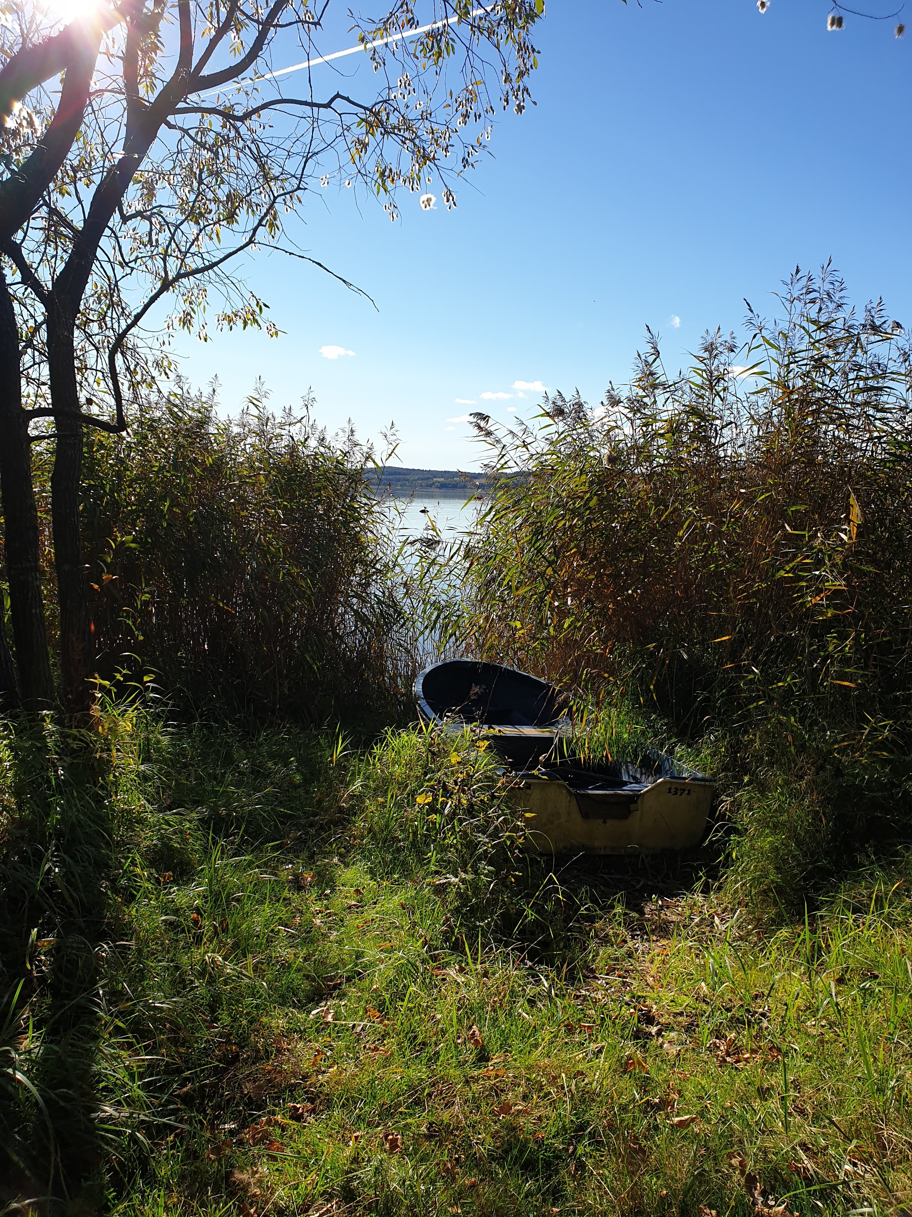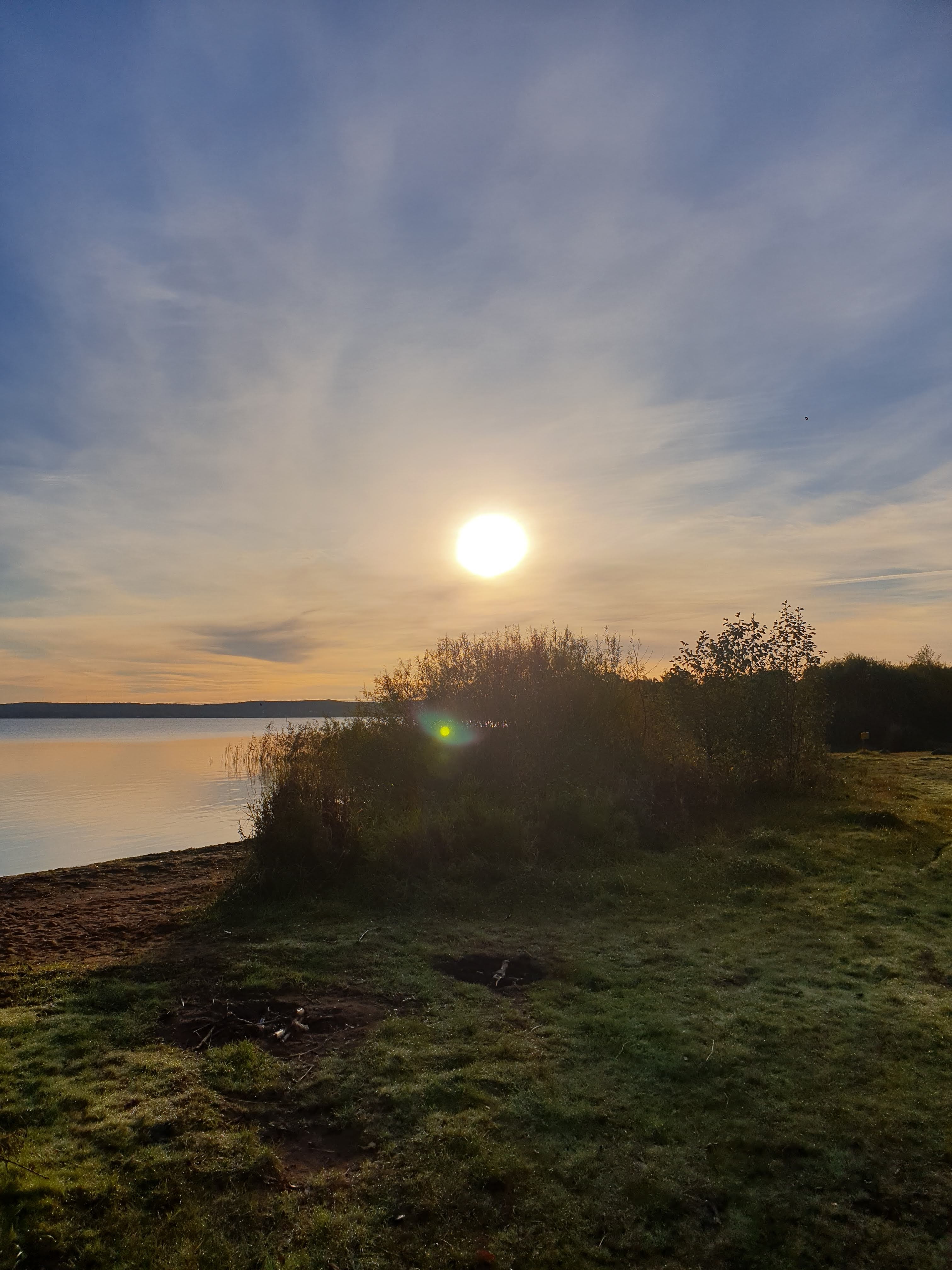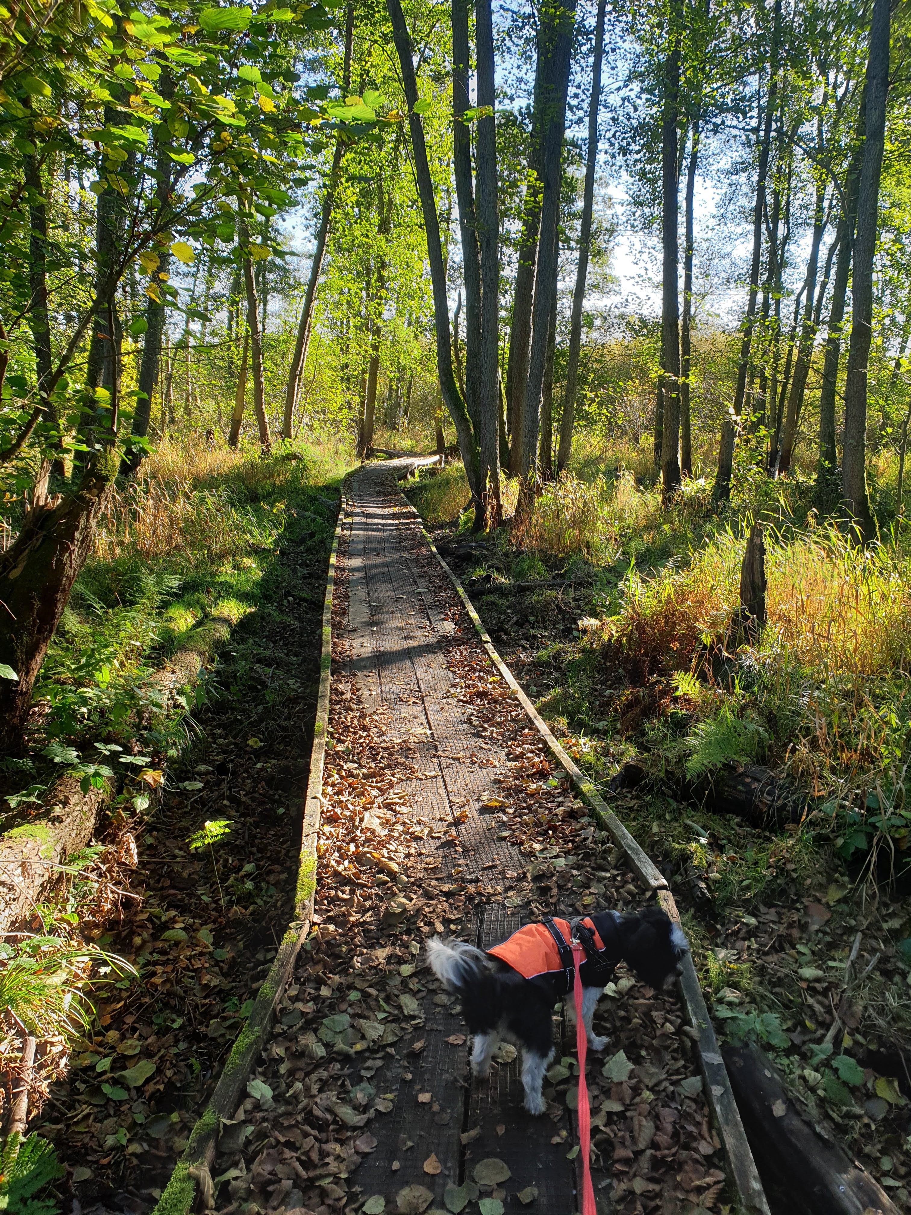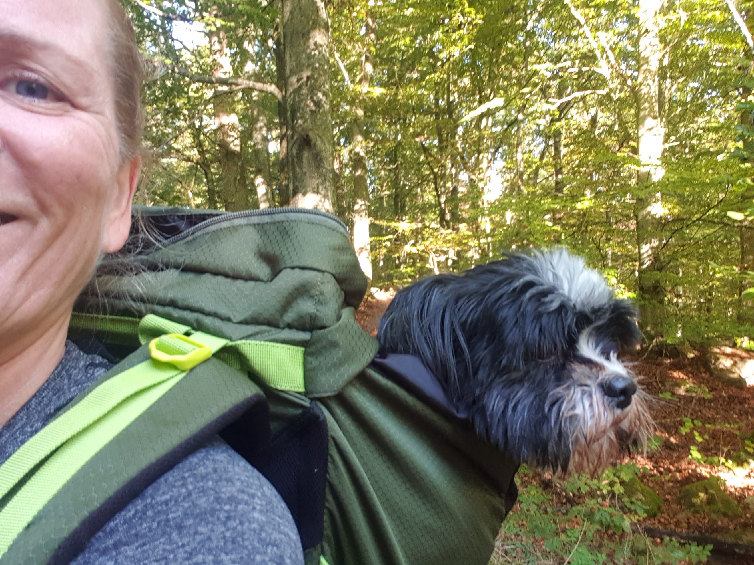 Men i strålande sol och vindstilla lyckades vi ta oss runt sjön, även om sista kilometern gick på ren viljestyrka. Trots att vi vandrar så mycket, så var två mil faktiskt i vår övre komfortgräns (lite över…). Gaston däremot pinnade glatt på, åkte motvilligt i ryggsäcken några kilometer på mattes begäran, men två mil var inget som dämpade hans entusiasm. Vi är djupt imponerade av vår lilla knähund ❤