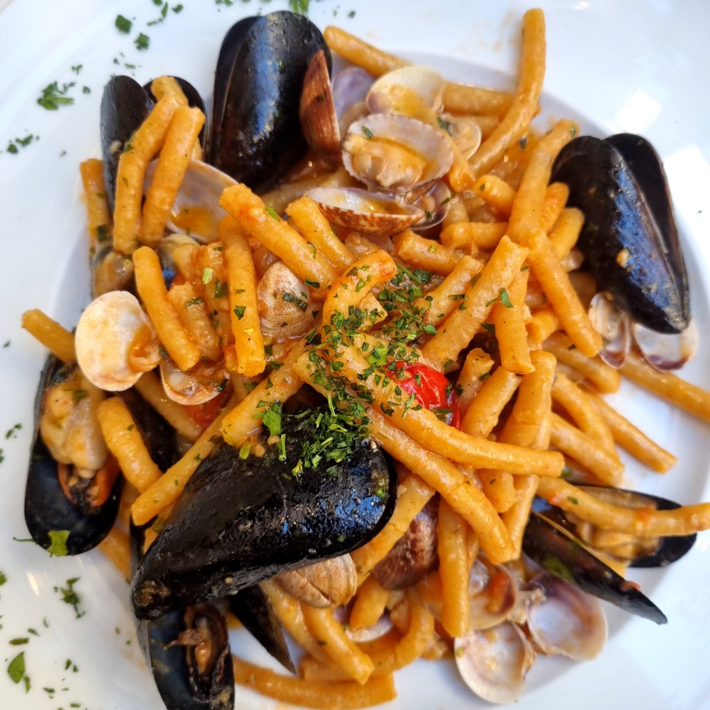 Det finns nästan lika många restauranger som souvenirbutiker, och vi valde en på måfå som visade sig ha otroligt god mat, Ristorante Bolognese. Och det här var en av resans billigaste måltider, middag för två med fördrink, vin och avec för under 50 euro. Så det är inte bara dieseln som är billig i San Marino. Det här med skatteparadis är kanske inte så dumt ändå 🙂