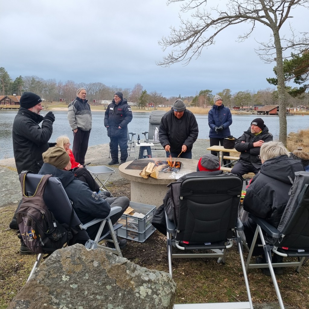 Alla samlades och vi gick oss upp mot ett av servicehusen för att sitta inomhus och mingla lite över bubbel och namnskyltar. Och sen fortsatte minglandet i två dagar. Där lunchen tog slut tog grillandet vid. Vi hade dessutom otrolig tur med vädret så vi kunde boka långbord till påsklunchen i lä mellan två plåtisar och sitta länge vid brasan nere vid vattnet. På den här träffen hann nog faktiskt alla prata lite med alla. Och inte var det mycket tekniksnack eller Vectronappar som diskuterades heller, utan mer bergsvägar, fricamping och mer udda resmål som Marocko, Färöarna eller nån som varit på Sicilien med husbil?