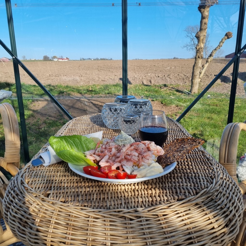Just nu sitter jag i det lilla växthuset och skriver det här med en fantastisk utsikt över Skånes landskap. Ikväll ska det avnjutas en räkmacka med handskalade räkor från Kåseberga. Det här med att ha plåtis är inte dumt alls!
