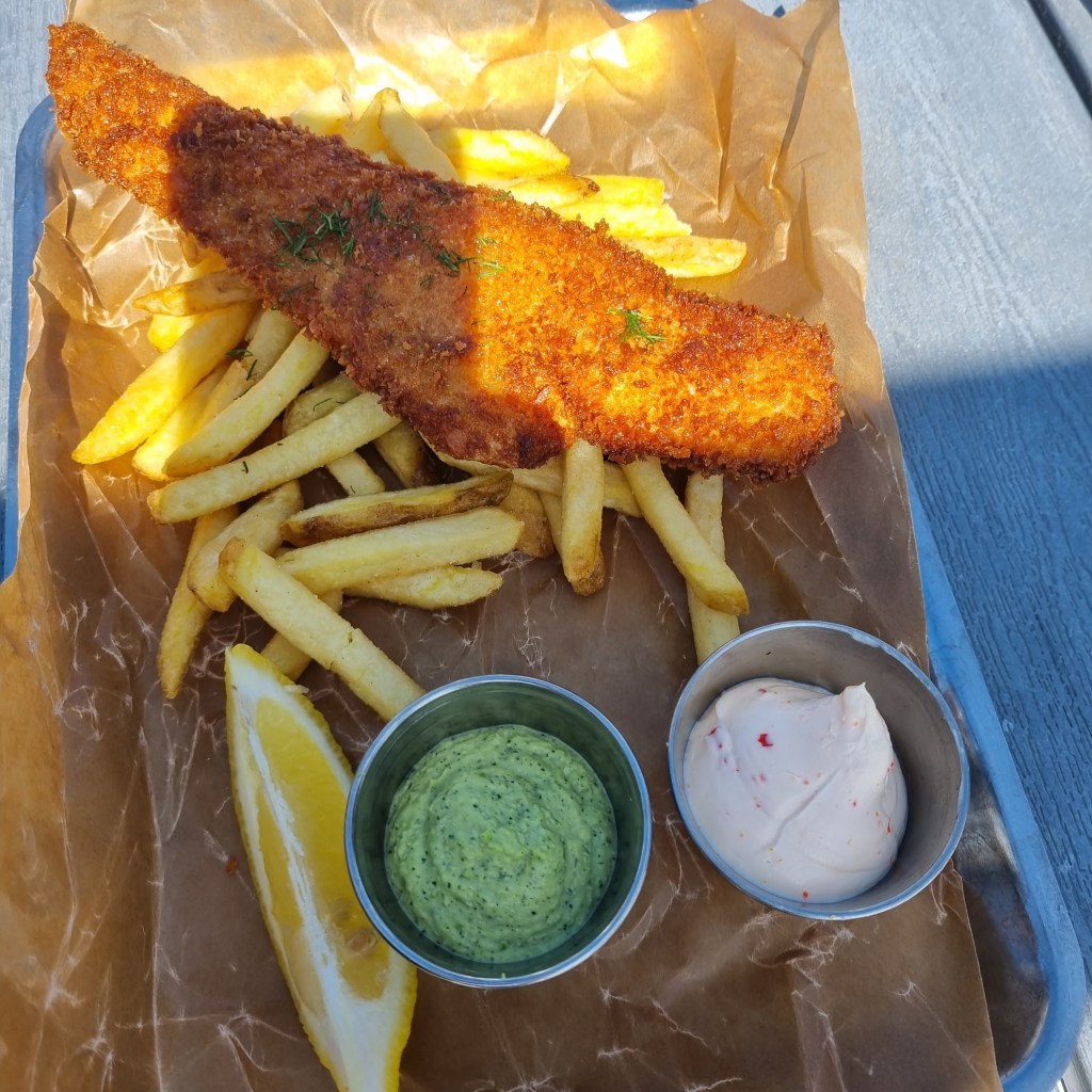 Nu var vi ju nära nästa favoritstopp för lunch, Burhes i Kivik, så varför inte ta en fish ‘n chips även där? Det är tur vi går så mycket varje dag – annars skulle vi snart rulla fram! Vi enades om att en kombination av de båda restaurangernas rätter skulle göra den perfekt – fisk och pommes från Buhres och såserna från Kåseberga:-)