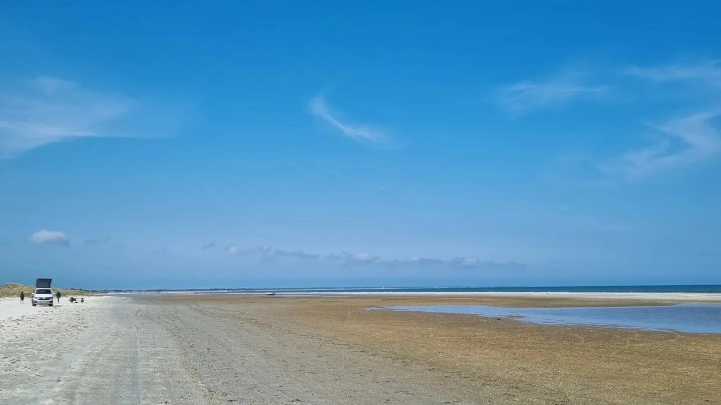 På Jylland har man stor påverkan av tidvattnet och här hade havet krupit ut säkert 50 meter. Överallt låg snäckor, tång och de små högarna med spiralformad sand ovanpå som knivmusslorna skapar när de trycker ut vatten från sitt gömställe nere i sanden. Gropar på stranden visade att folk lyckats gräva upp en knivmussla eller två till middag.
