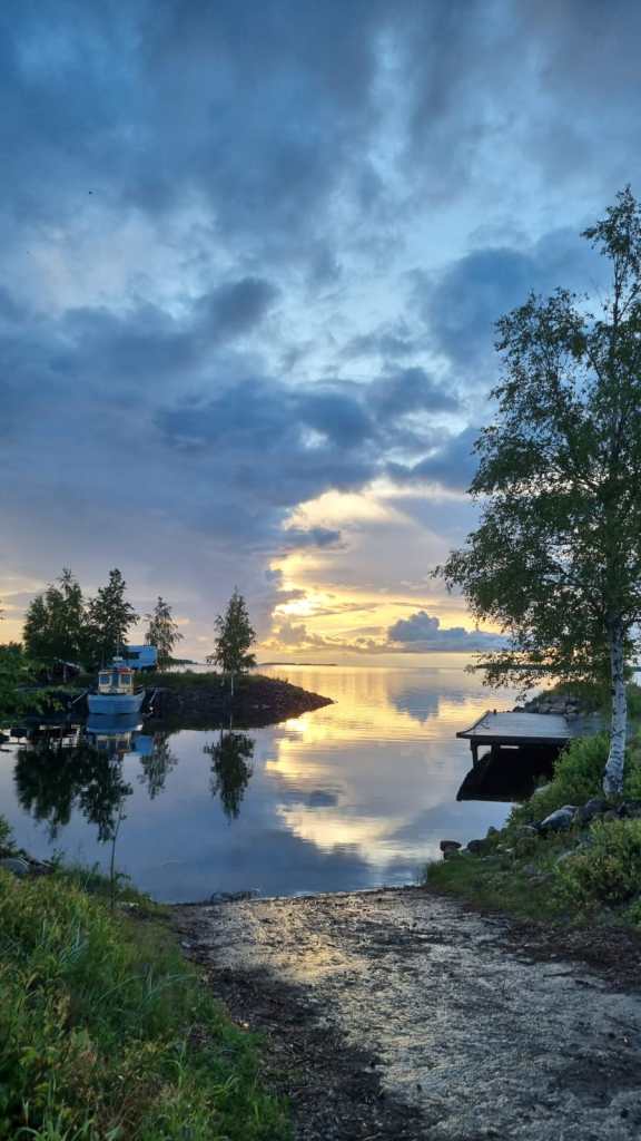 Första natten slog vi läger i en liten hamn ett finskt lappkast från Praava. Visserligen bara en stor grusplan men med fantastisk utsikt! Och faktiskt en liten glasskiosk som var öppen trots att det var i stort sett öde i hamnen hela kvällen.