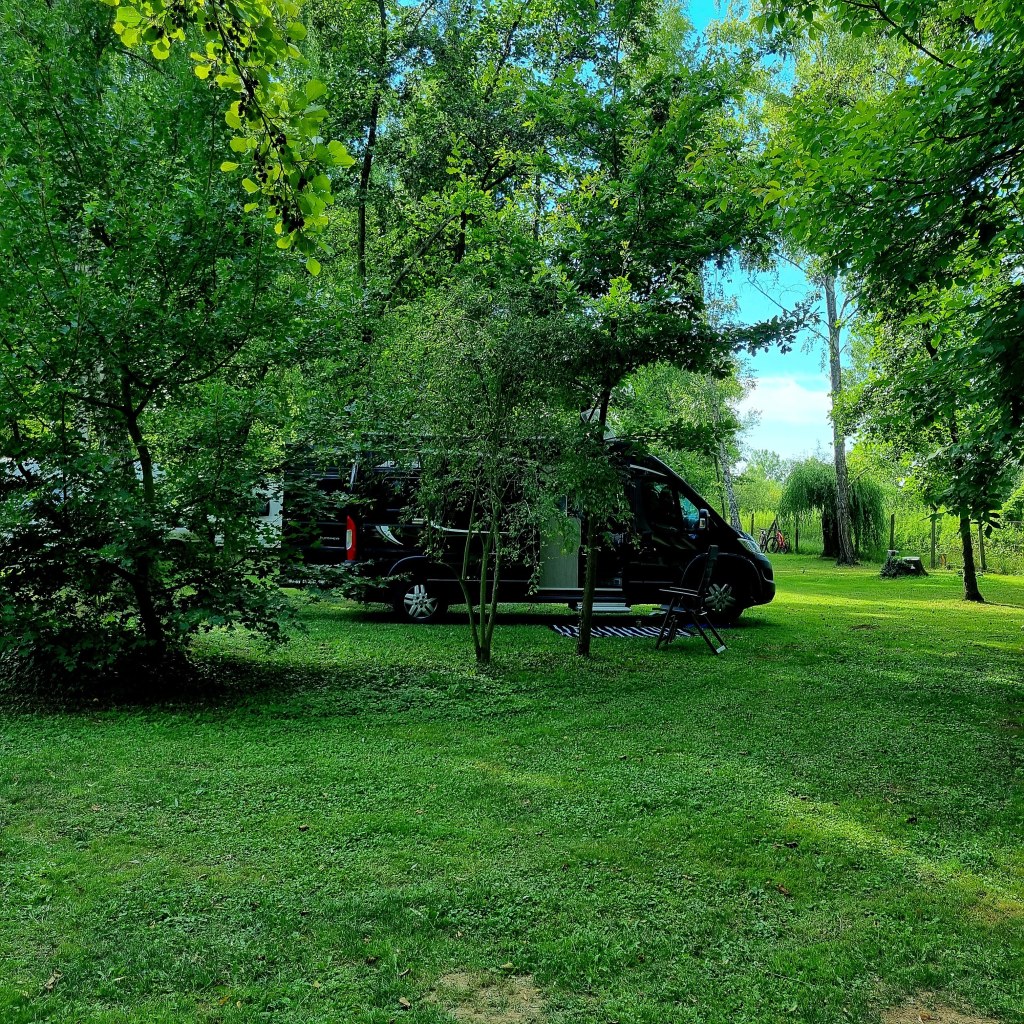 Efter en dag på helt fruktansvärda vägar (en del såg ut som om man släppt en bomb på dem), men fantastiska solrosfält överallt, ringde vi till en liten naturcamping vi hittade på Park4Night. Mannen som svarade sa att vi absolut var välkomna, men att de hade hyrt ut sina fem stugor till ett sällskap som skulle ha ”pool- och saunaparty” och att det kanske skulle störa lite. Vi tänkte att det kan vi säkert hantera och meddelade, till hans stora förvåning, att vi skulle komma ändå.