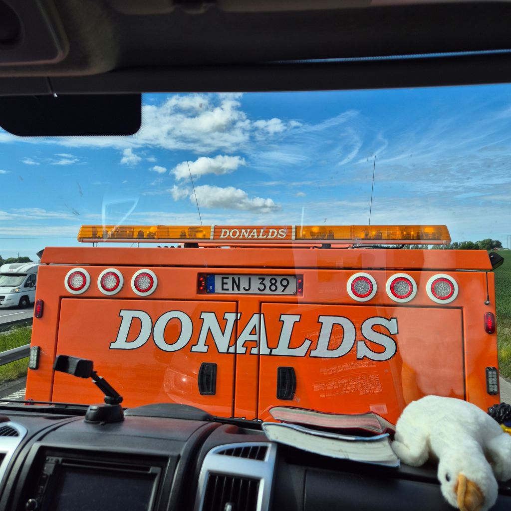 När vi stannat på Glumslövs backar och tankat både bil och magar, kom vi inte många meter på motorvägen förrän nånting smällde till! Första tanken var en enkel punktering. Fast sen lät det som om nåt släpades under bilen så modet sjönk.